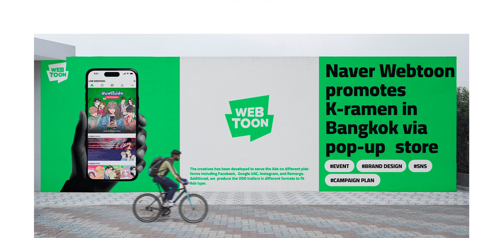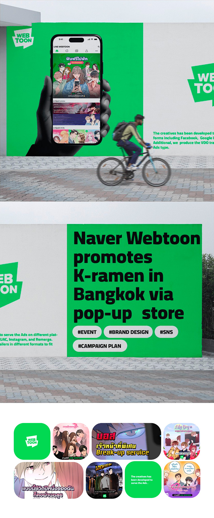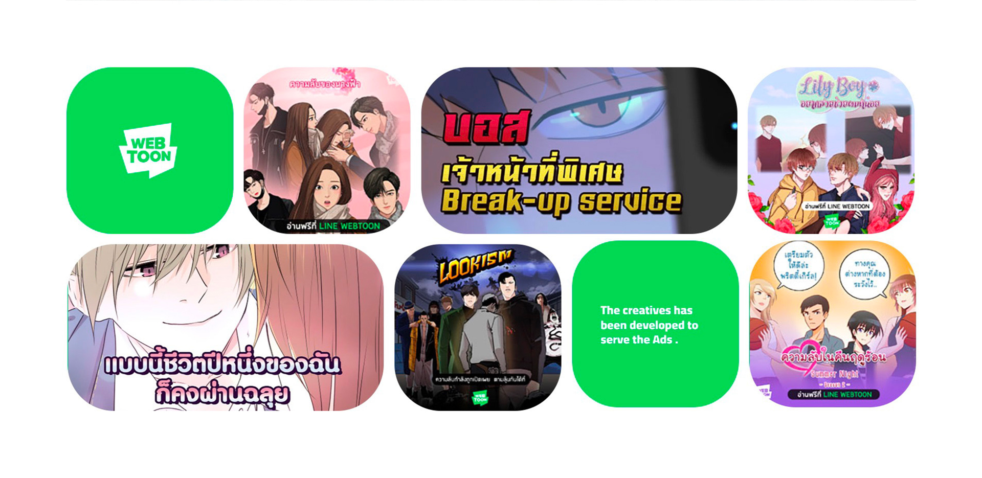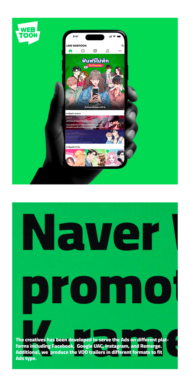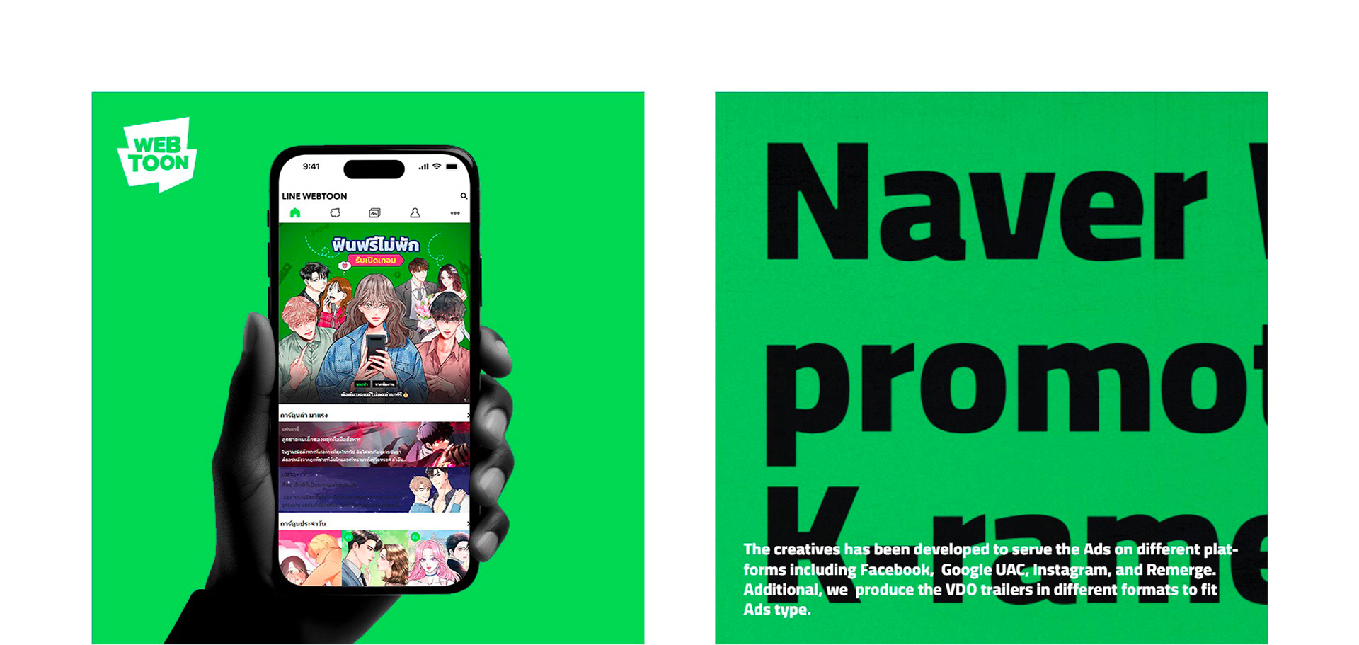ออกแบบ Banner สำหรับการโฆษณาผ่านแพลตฟอร์มต่าง ๆ เช่น Meta, Google UAC และ Remerge นอกจากนี้ ยังทำการผลิต VDO Trailers ในรูปแบบที่หลากหลายเพื่อรองรับการโฆษณาต่างๆ